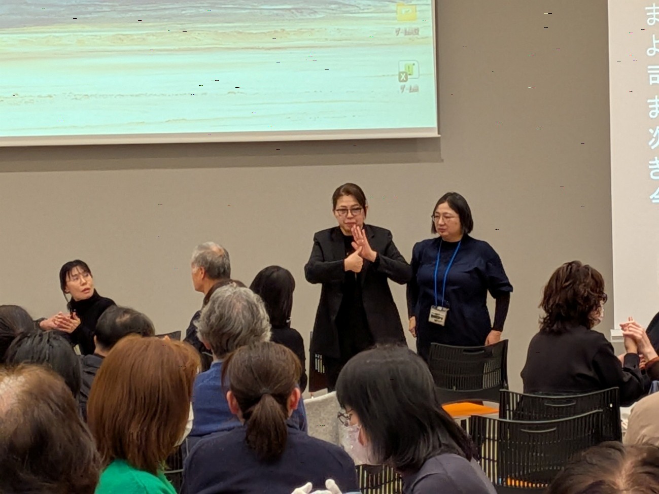 字幕と音声ガイド付きで、盲ろう者だけでなく、多くの聴覚障害者、視覚障害者の参加もありました。